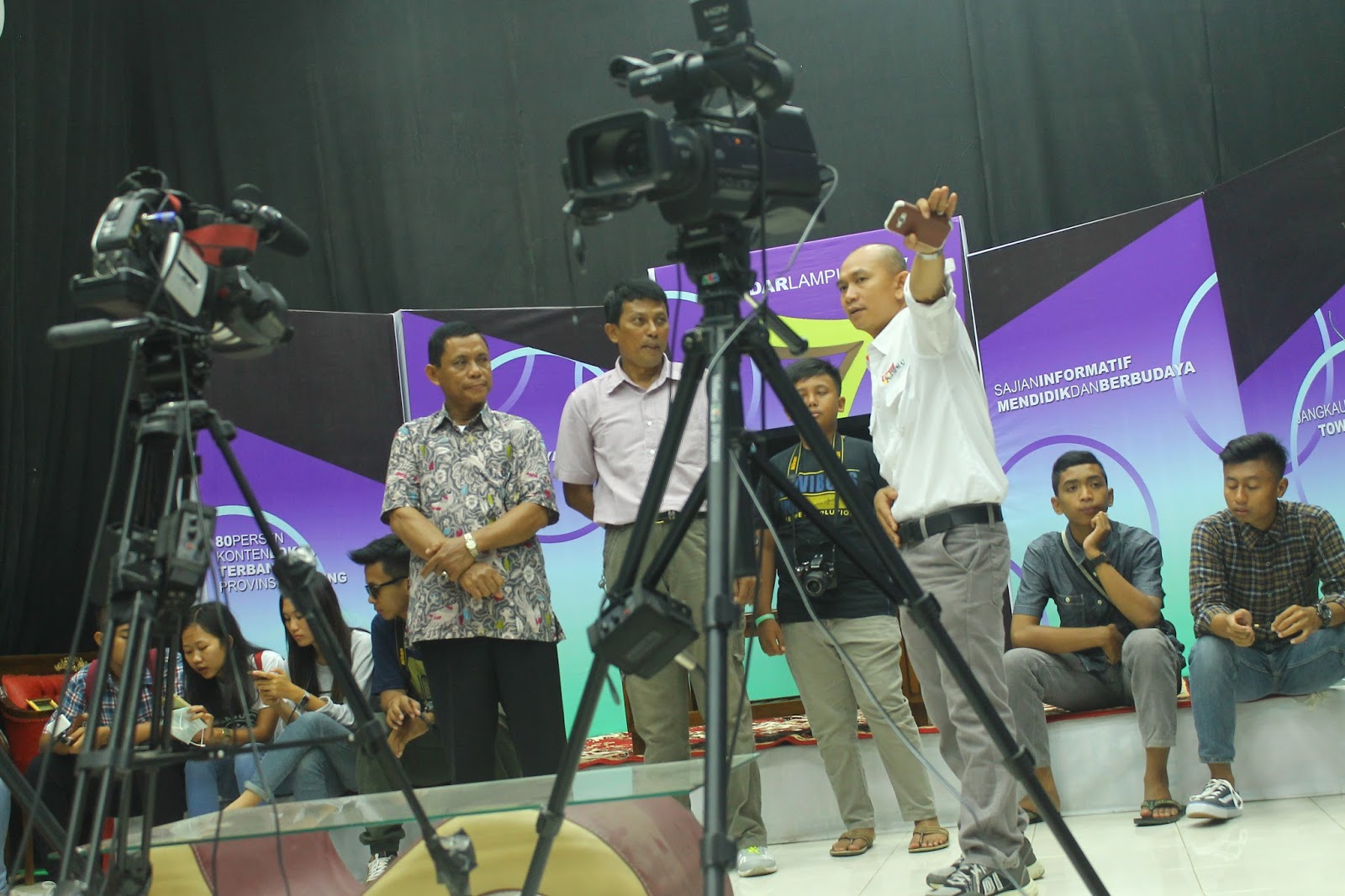 Lalu setelah selesai dijelaskan mengenai koran,kegiatan dilanjutkan di studio Radar TV dengan beckground kain hitam dengan banyaknya lampu penerangan dan 3 buah camera yang memang sengaja dipasang disana. Dalam satu studio itu terdapat banyak sekali set acara televisi,seperti set acara berita, musik, dll. Disini siswa-siswi menerima informasi tentang fungsi ruangan ini,bagaimana proses pengambilan sebuah gambar berita secara langsung.